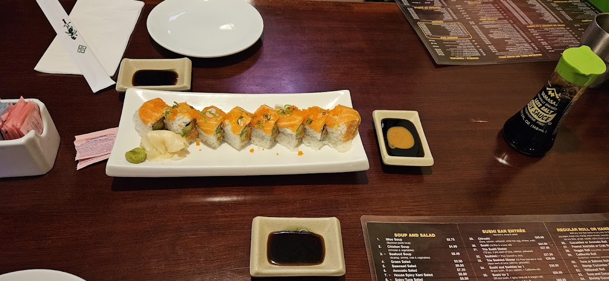 Spicy lobster salad & mango inside topped with salmon avocado & tobiko