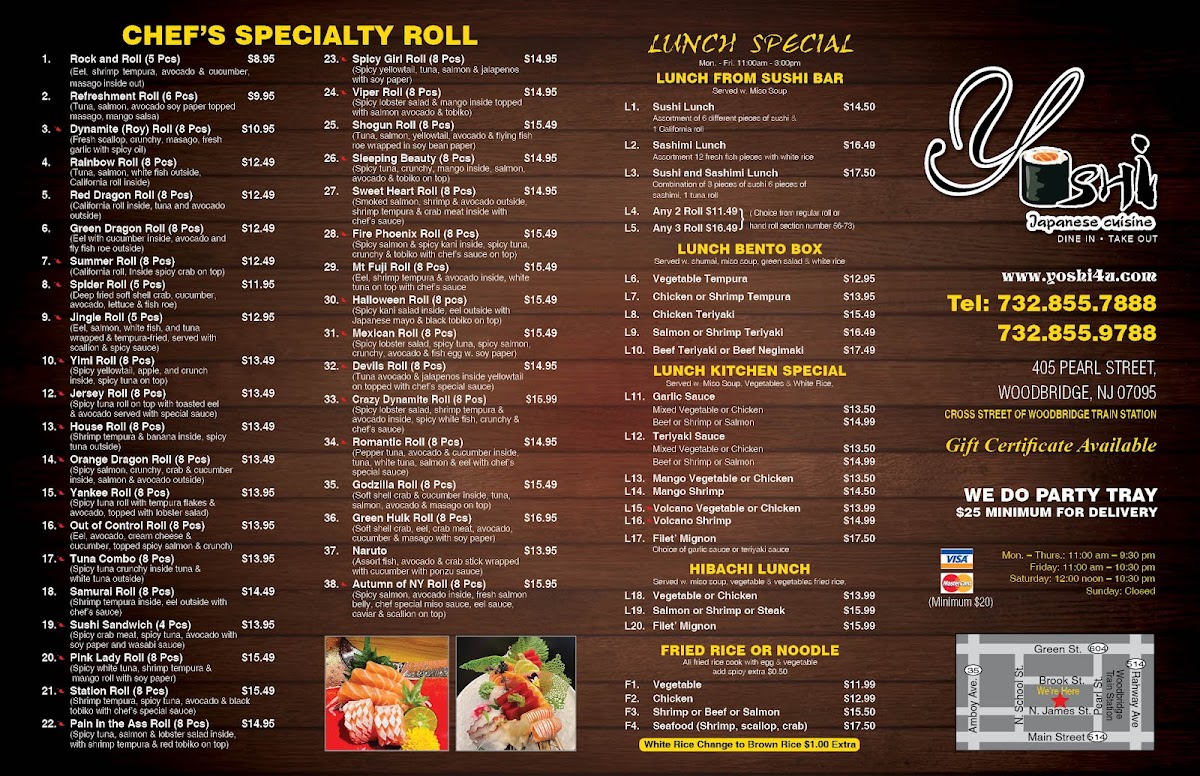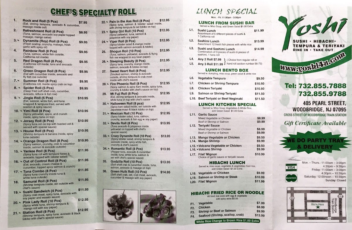 Looking for an unforgettable meal? The Yoshi Sushi & Teriyaki Menu offers an exciting mix of flavors, perfect for sushi lovers and those craving something a bit more unique. Located in the heart of Woodbridge, NJ, the menu features an array of fresh sushi rolls, including classic favorites and specialty creations that pack a punch. Whether you're in the mood for a savory teriyaki dish, a refreshing sashimi plate, or a hearty bento box, Yoshi delivers something for every taste. Every dish is made with the finest ingredients, and the flavors speak for themselves. You'll find the perfect balance of sweet, salty, and savory in each bite, making it a go-to spot for anyone who appreciates delicious, high-quality Japanese cuisine. So, whether you're here for a quick lunch or a relaxed dinner, Yoshi’s menu has something to excite your taste buds.