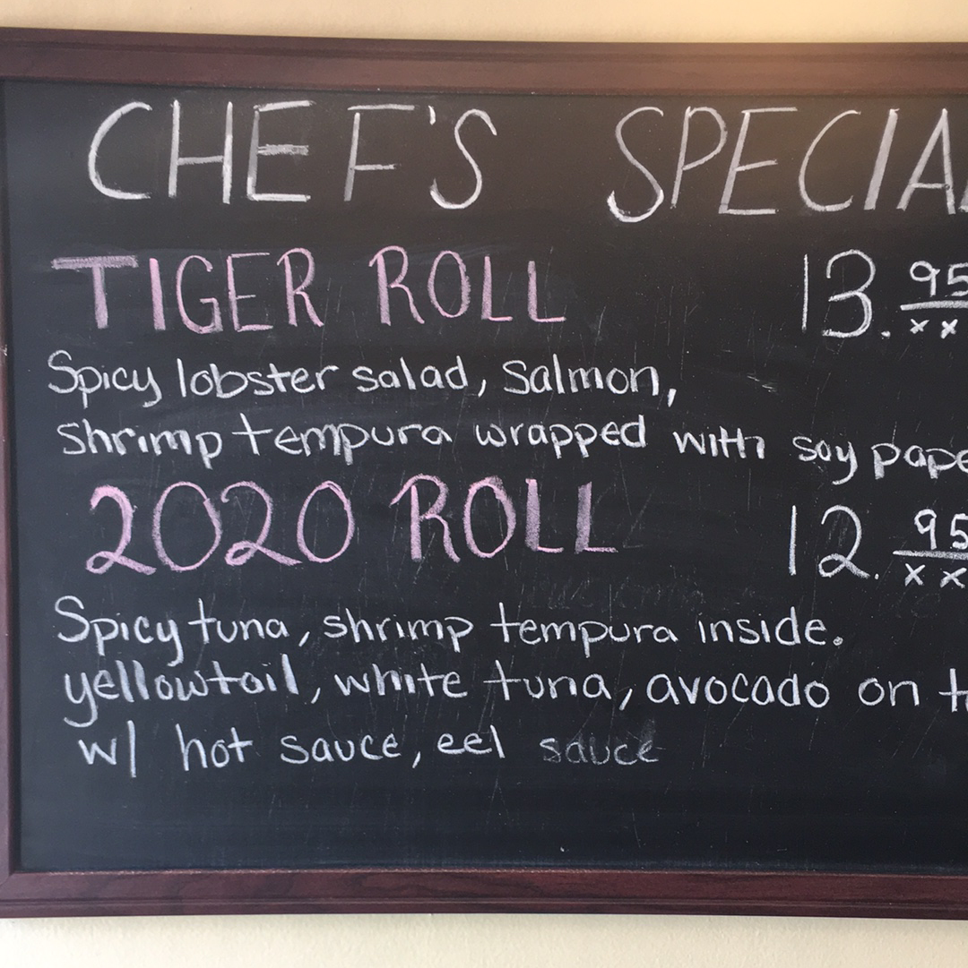 Eel, shrimp tempura & avocado inside, white tuna on top with chef's sauce